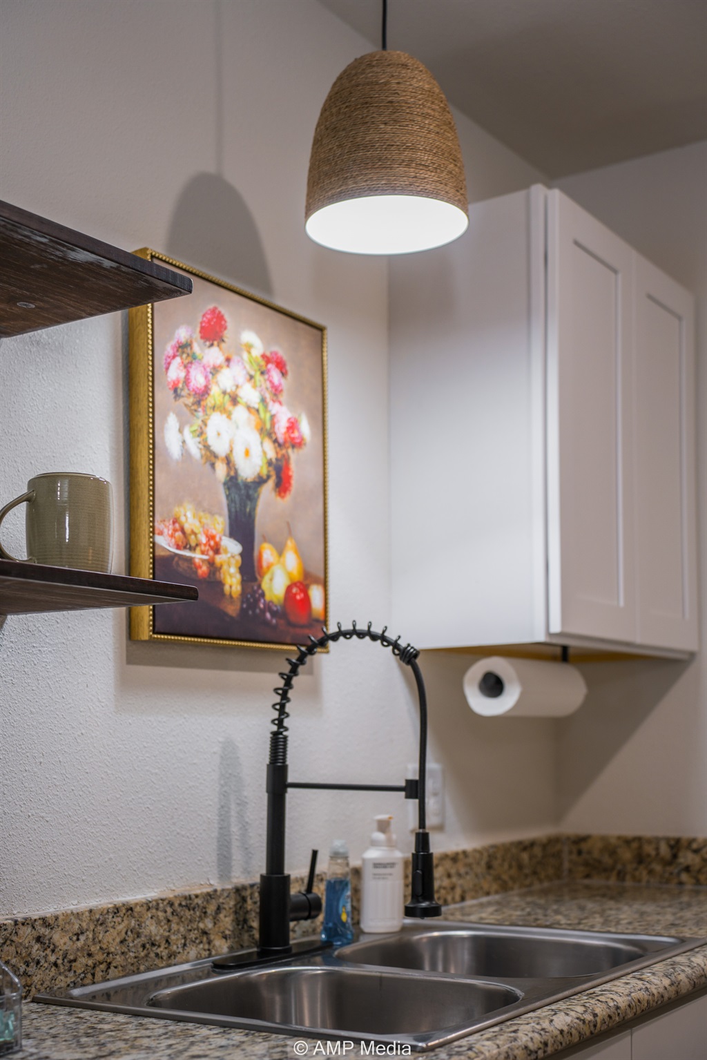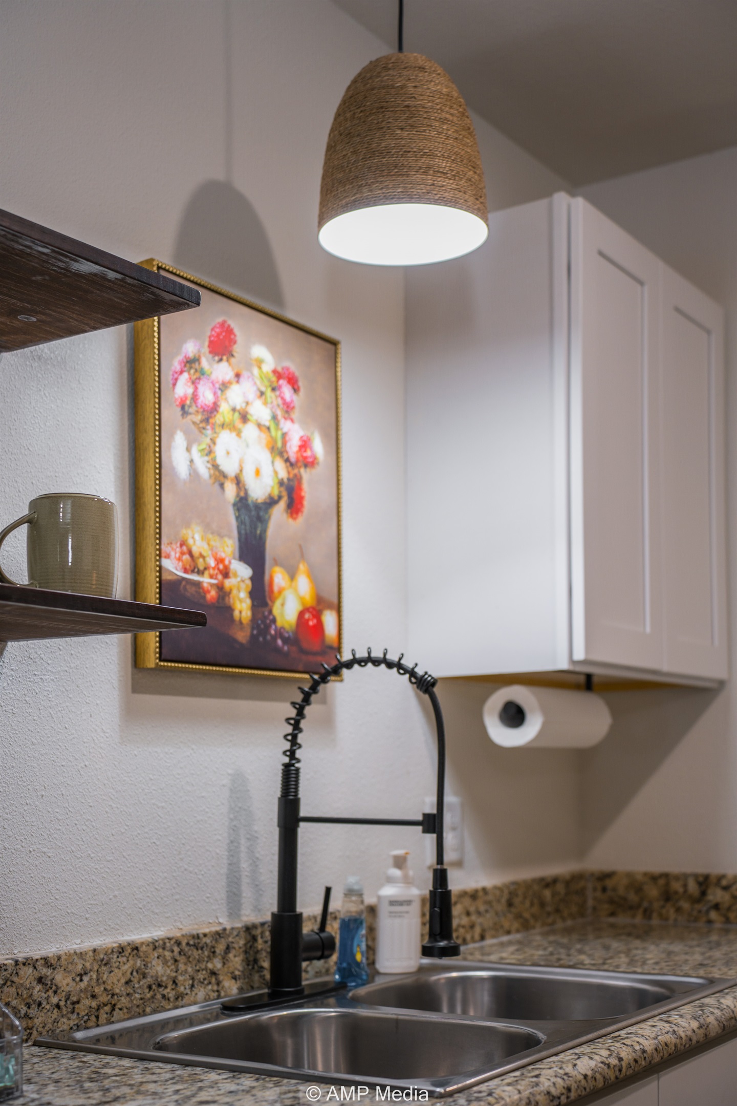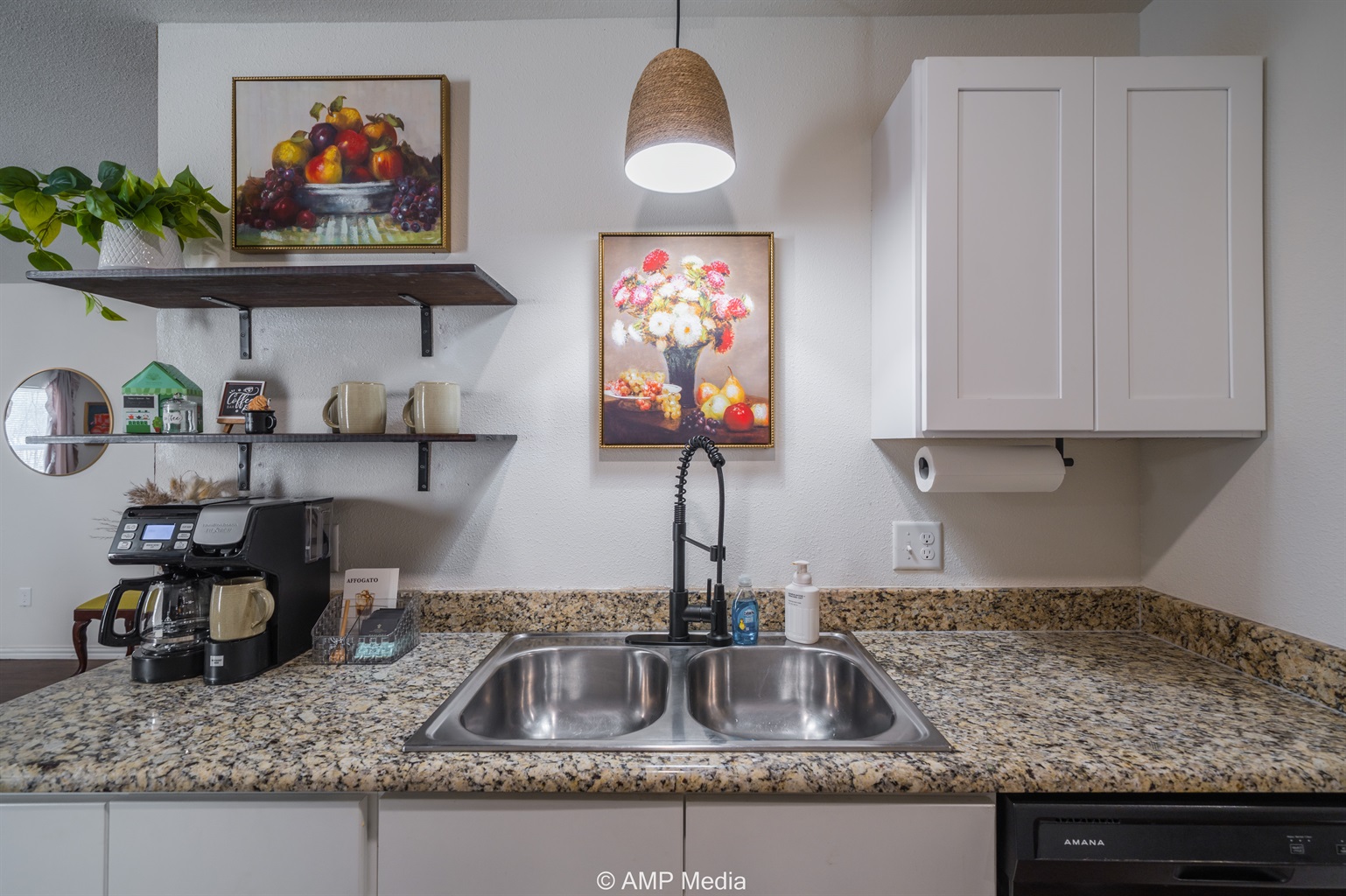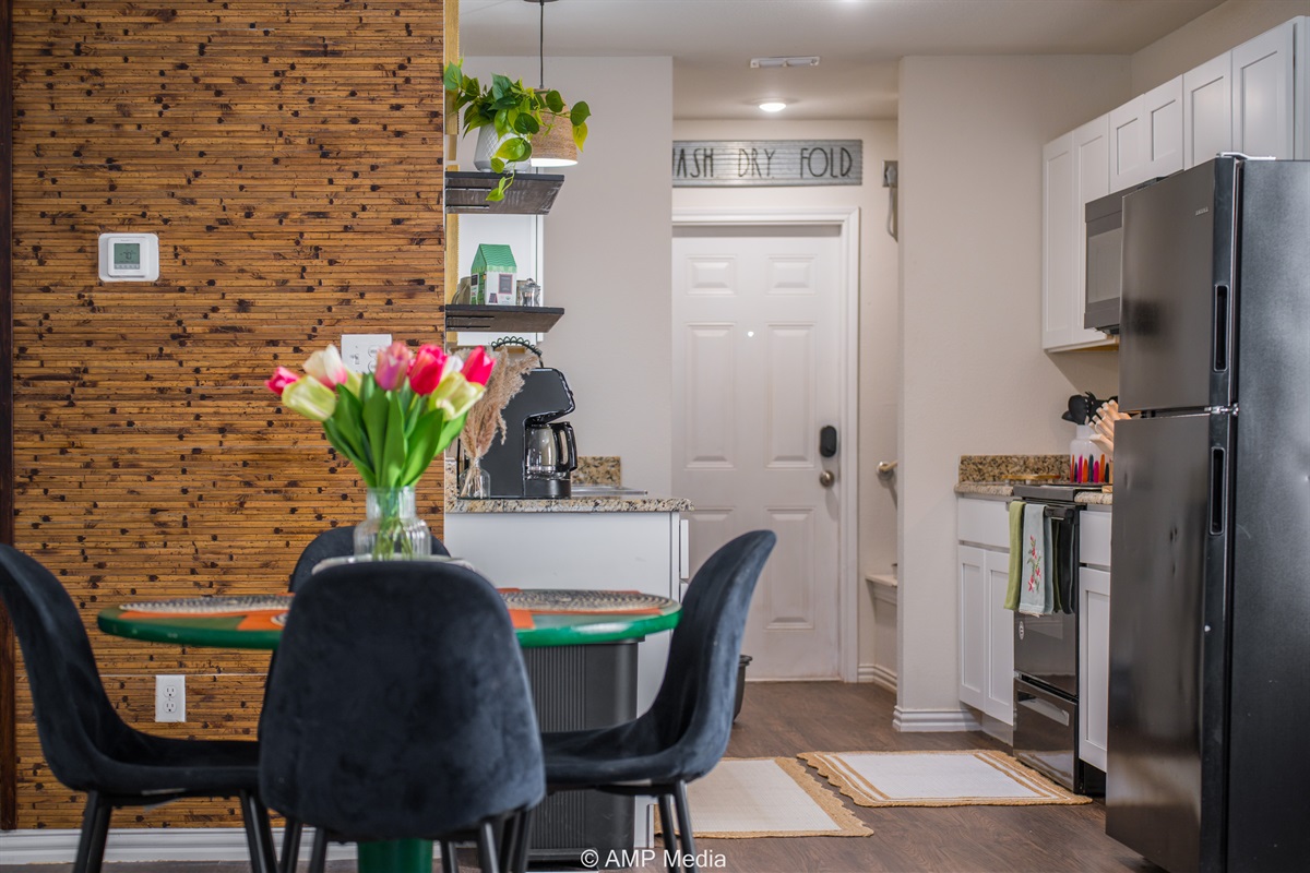 The well-appointed kitchen comes equipped with granite countertops, all essential appliances, and everything you need to prepare anything from quick breakfasts to full family dinners. Open shelving adds a touch of rustic charm, while modern amenities ensure convenience. Gather around the striking emerald dining table – it's not just furniture, it's a conversation starter.
