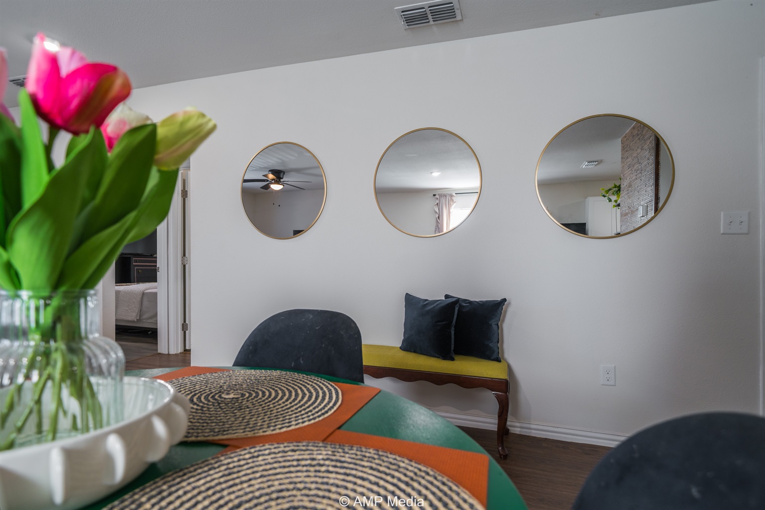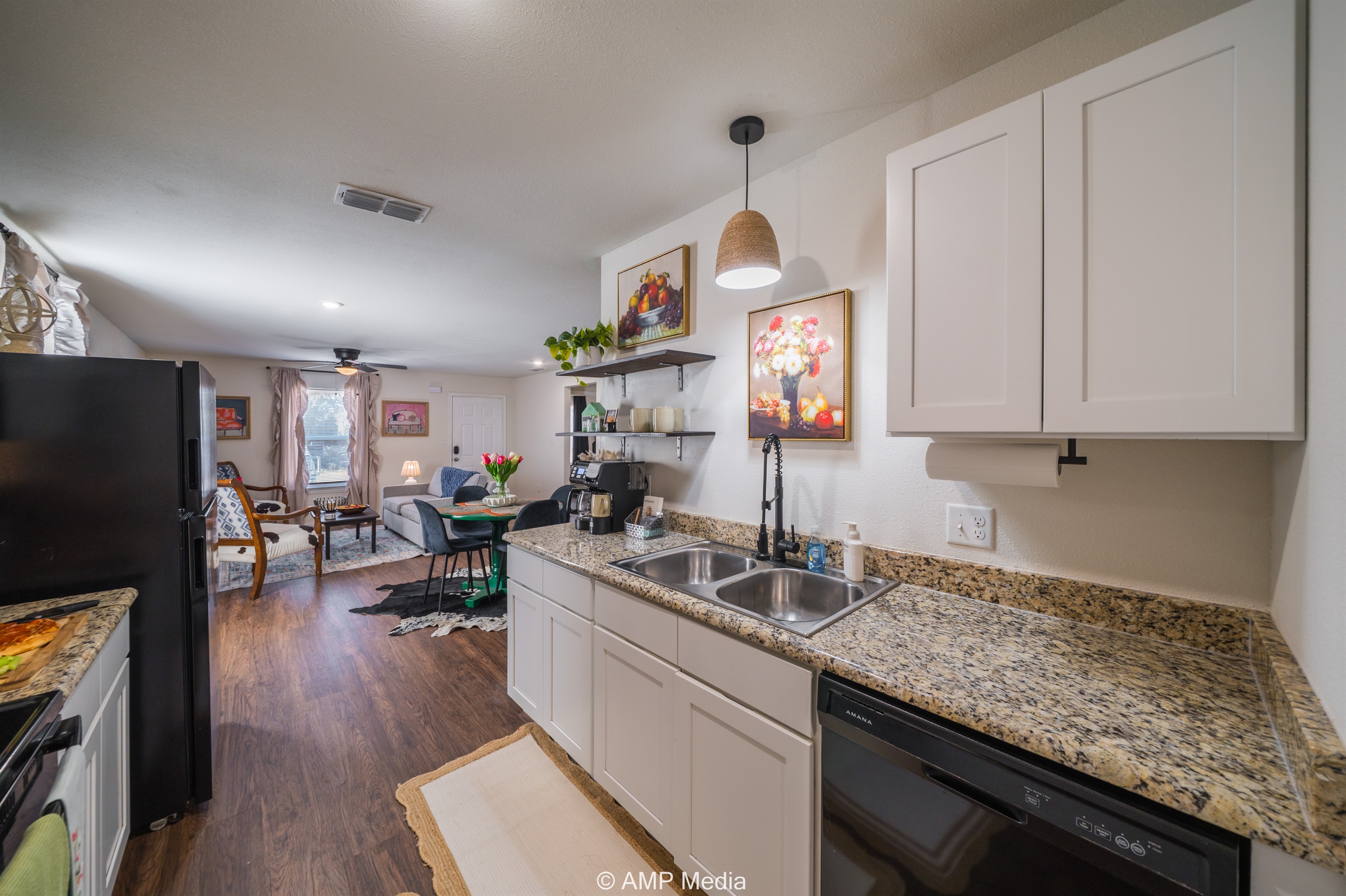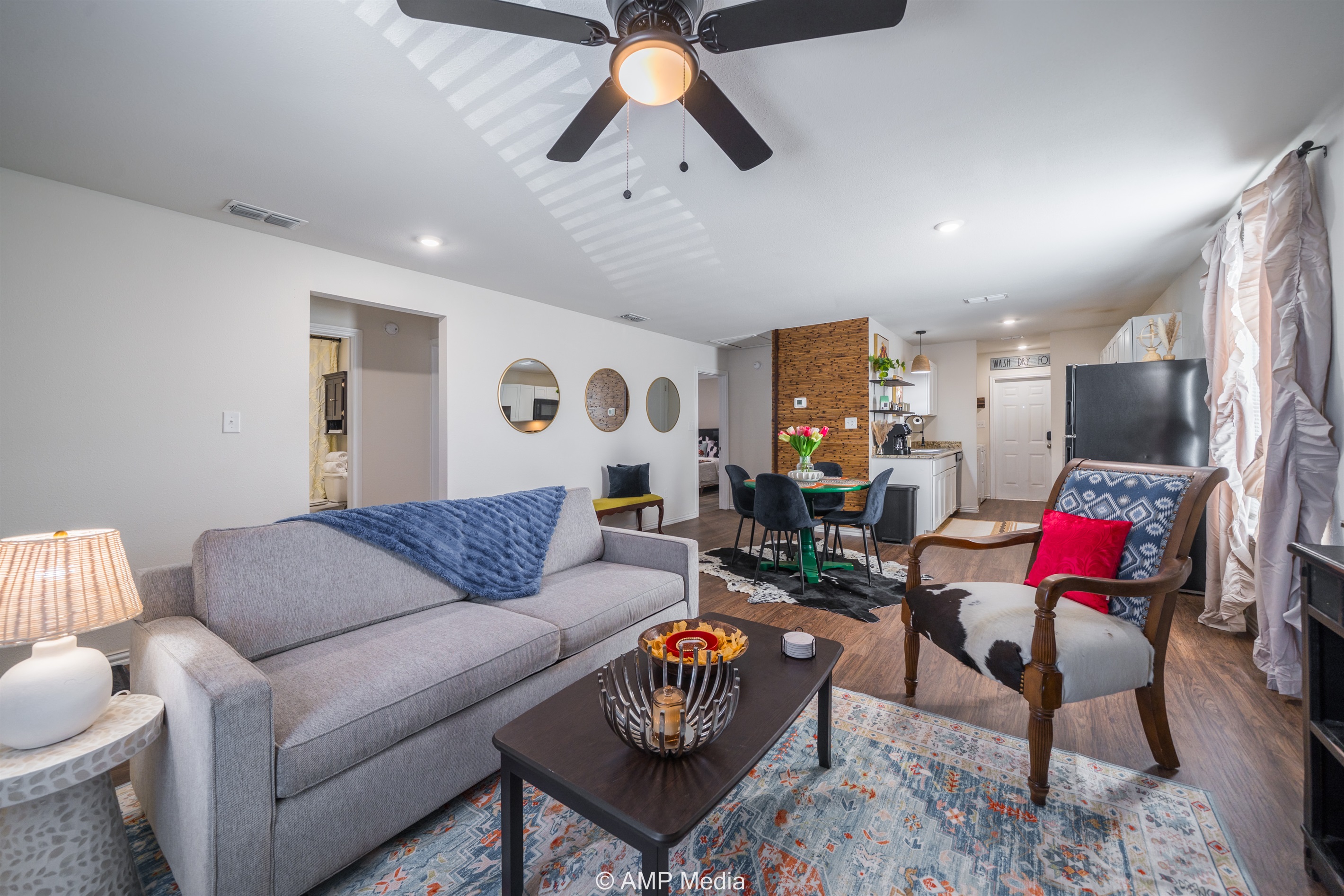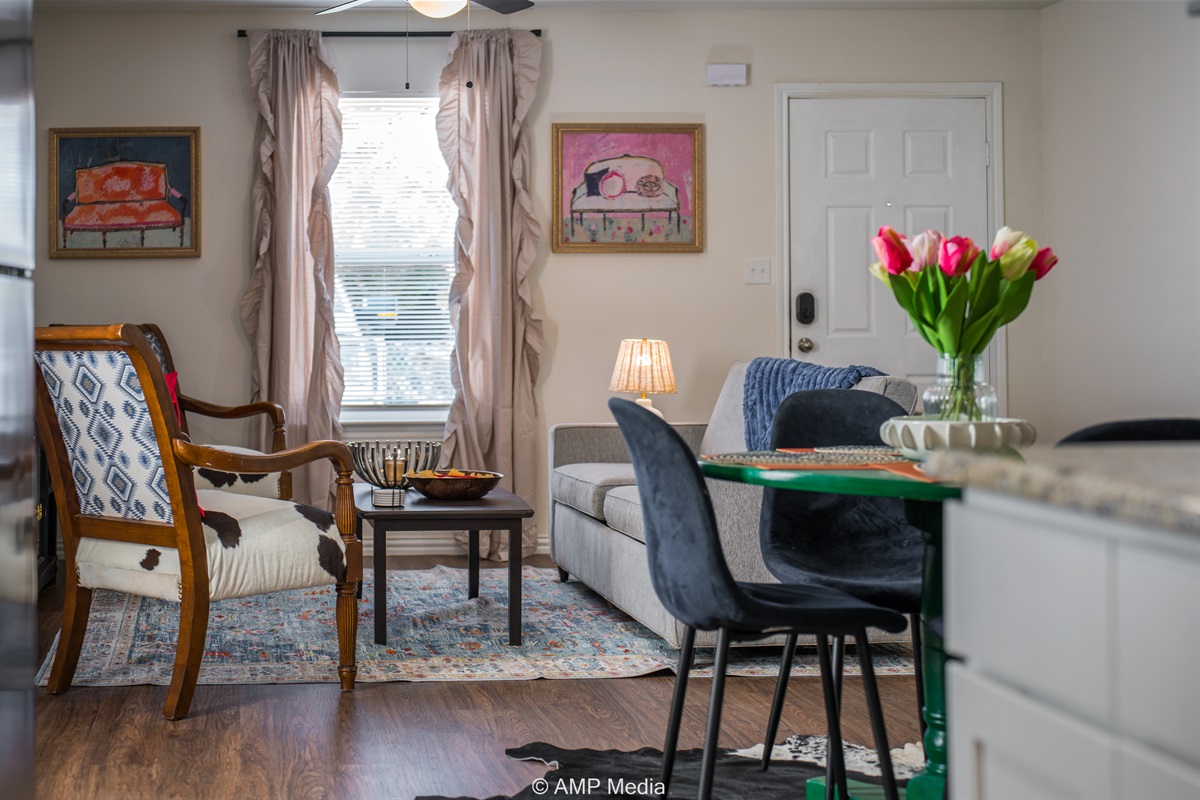 Step into an inviting open-concept layout where natural light dances across wood-style flooring and carefully curated decor creates an atmosphere that's both sophisticated and welcoming. The living area features plush seating perfect for gathering with loved ones, while unique artwork and pops of color throughout add personality and warmth. It's the kind of space that instantly makes you feel at home.